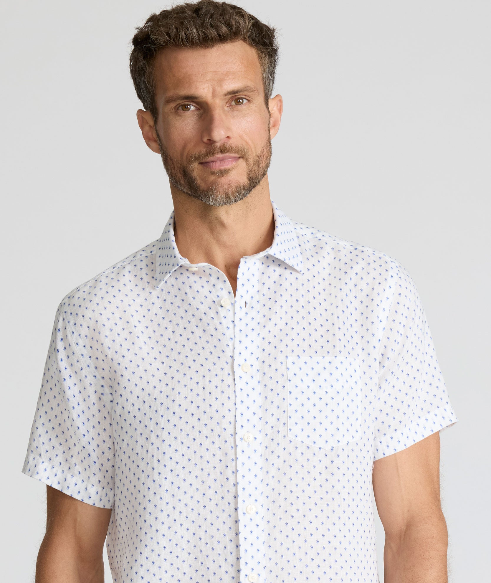 Your sunny-day style isn’t complete without this breezy short-sleeve linen shirt in a cool diamond print. Its lightweight fabric will keep you cool and comfortable when the temps and humidity rise, so you can always look sharp and feel comfortable no matter where you’re headed. Wear it with a pair of our water-repellent, wrinkle-fighting Traveler Tech Shorts to ace your next warm-weather look.