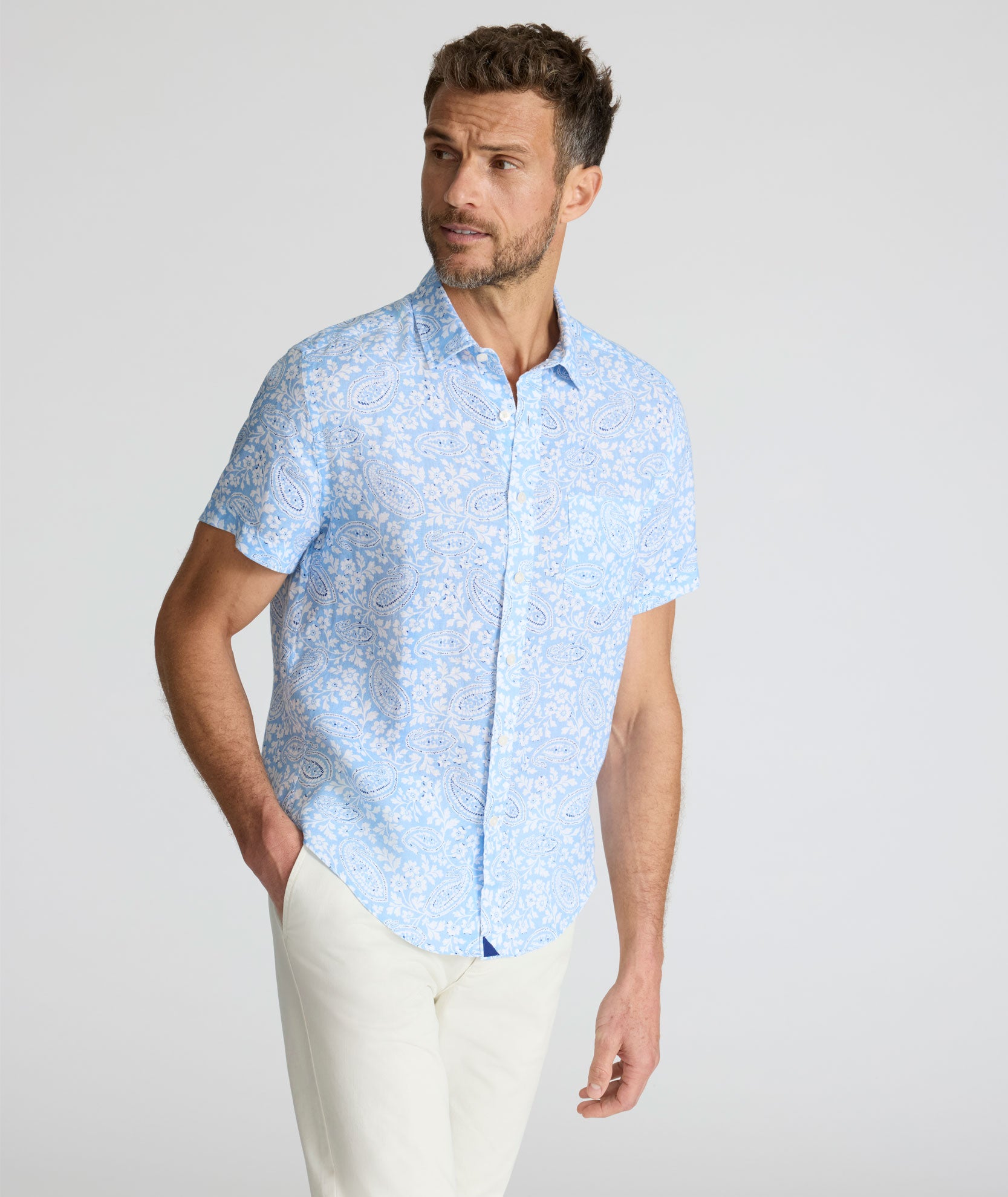 Your summer look isn’t complete without this breezy short-sleeve linen shirt. When temperatures rise, you need this lightweight fabric to cool and comfortable. We gave this bold style a vibrant, eye-catching print design to help you stand out from the crowd this season. Wear it with our water-repellent, wrinkle-fighting Traveler Tech Pants to look great in a flash for your next sunny-day outing.